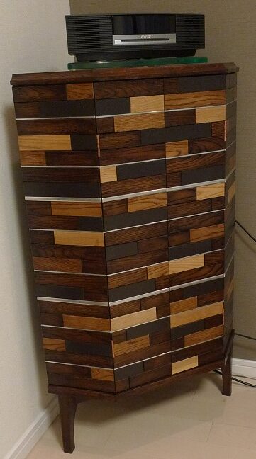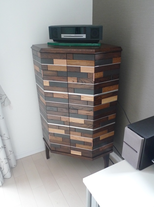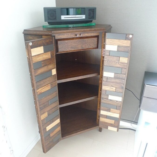 キャビネットの扉は、裏表老面ともブロック型に成形したナラ材を複数パタンで着色し、1つ1つ組み上げました。