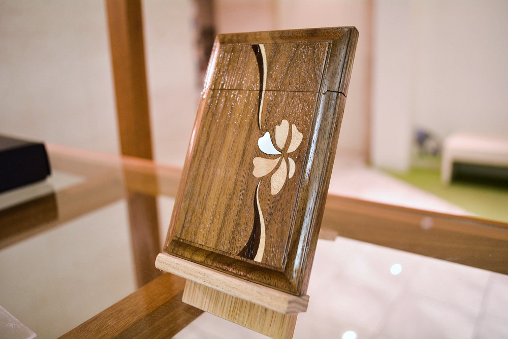 額の中の桜をイメージしてデザインし、象嵌職人さんに木象嵌を入れて頂きました。アクセントとして1枚の花びらだけ貝が埋め込んであります。