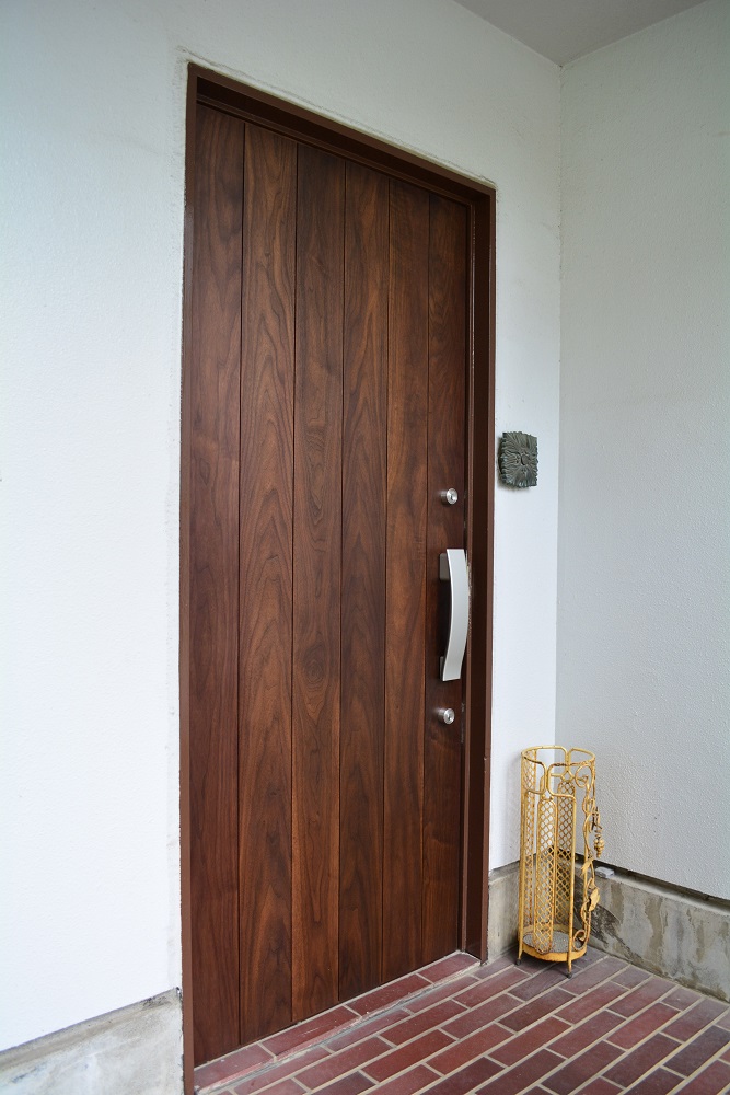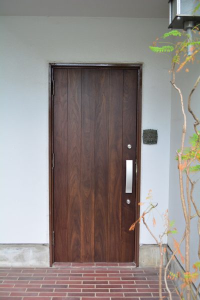 ウォールナットの無垢材を贅沢に使用した玄関ドア。