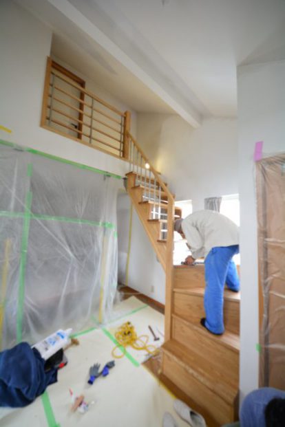 階段の踏み板をビス止めし、見えないようダボ穴を埋めました。