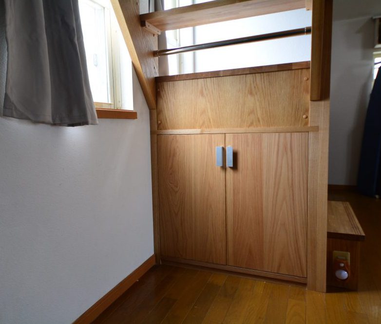 傾斜の緩い部分の階段裏に収納を設置しました。