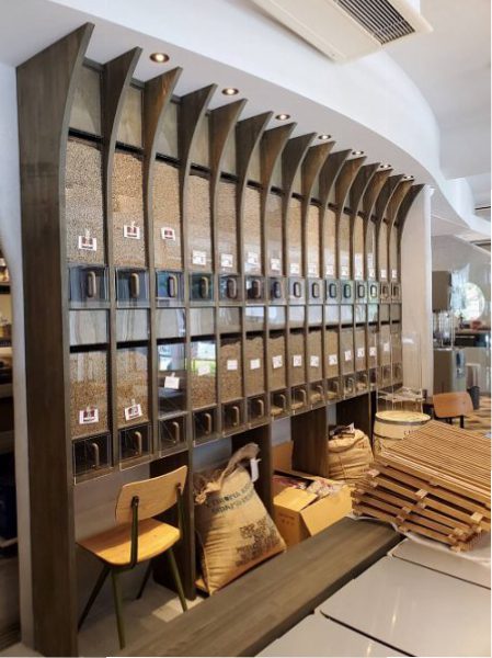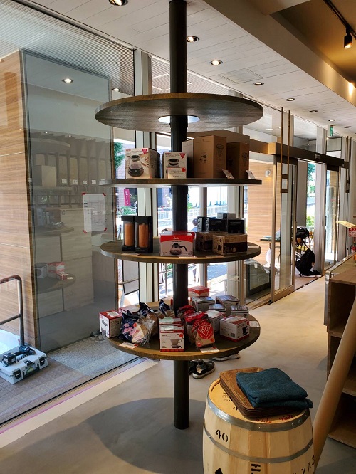 カウンター、客席テーブル、コーヒー豆収納、円形のディスプレイ棚、他…