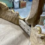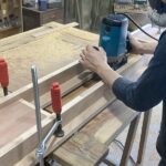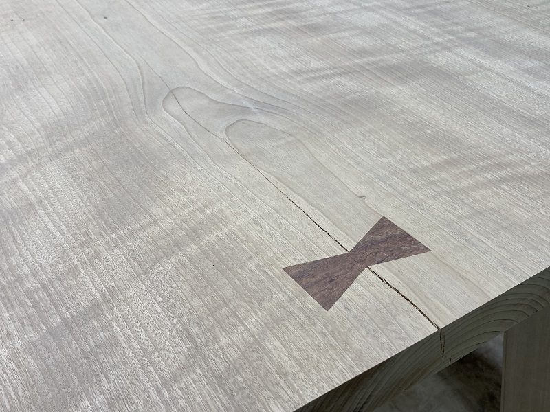 割れ部分に契りを入れた四方転びのデスク製作。こちらは天然無垢材の一枚板を使用しました。