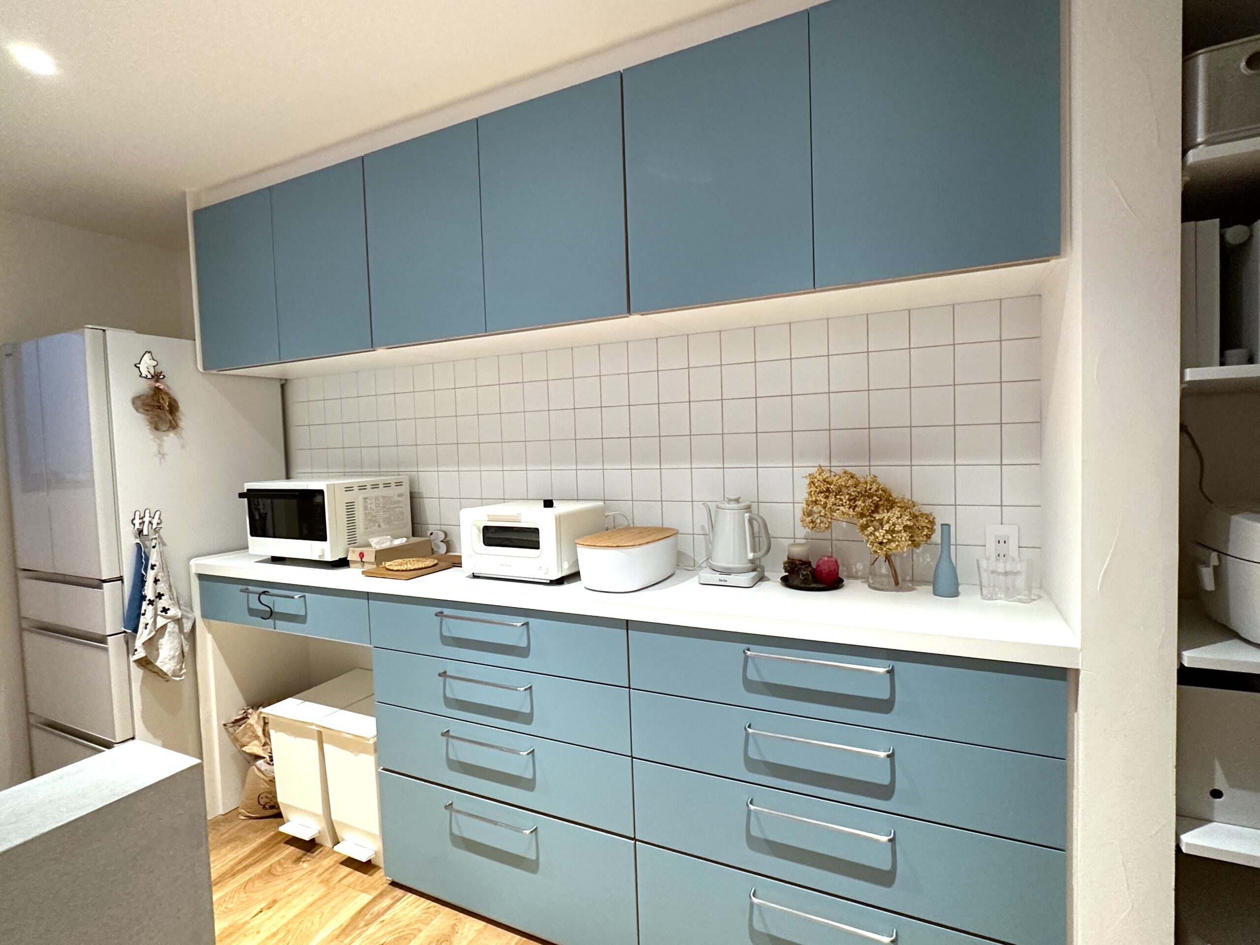 食器棚の扉は、既製品からファニチャーリノリウムの扉に一式交換いたしました。