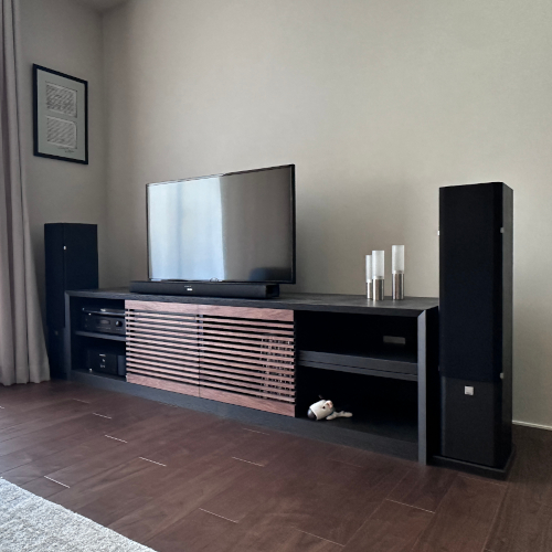 テレビやスピーカーを配置しても圧迫感がなく、空間に自然になじむ落ち着いた存在感を放っています。