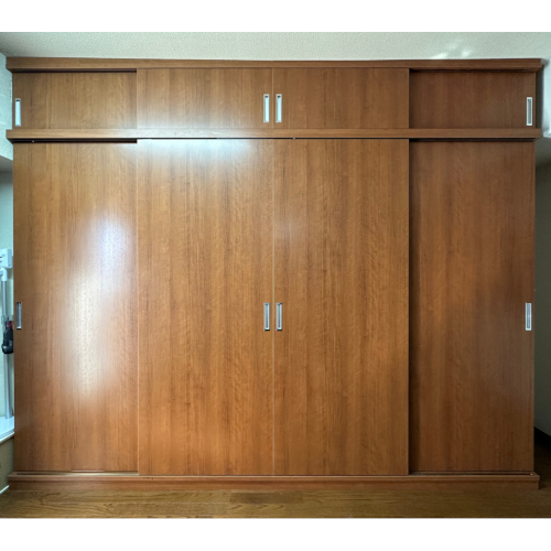 収納不足を解消したいというお客様のご要望に応じて、壁面いっぱい・天井いっぱいに設置できる大型収納家具を製作・施工しました。お部屋の梁やコンセント位置など既存環境に合わせた完全オーダーメイドです。